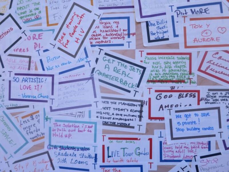 Down on Canal Street, Mayor-elect Bill de Blasio has set up a tent for New Yorkers to "talk transition." Among the activities: Writing your wishes in marker on nametags and slapping them up on the wall. Dodge & Burn's Victor Jeffreys went down to check it out and see what New Yorkers are asking for.